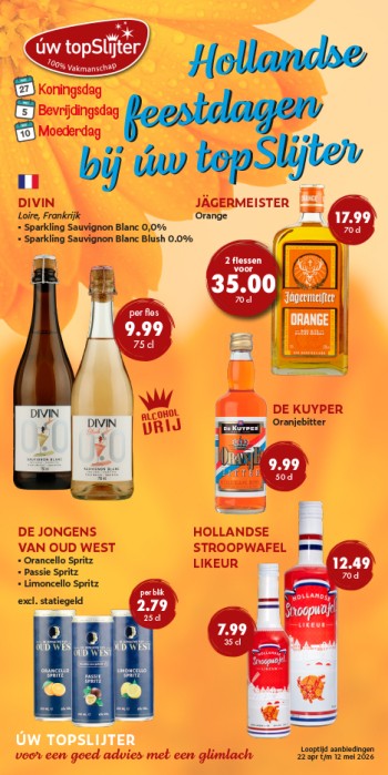 De komende weken staan de meest geliefde Hollandse feestdagen op de kalender: Koningsdag, Bevrijdingsdag en Moederdag. Deze speciale gelegenheden vragen om feestelijke drankjes en bijzondere cadeaus. In onze slijterij hebben we een aantal mooie aanbiedingen voor je samengesteld, zodat je optimaal kunt genieten van deze feestdagen.